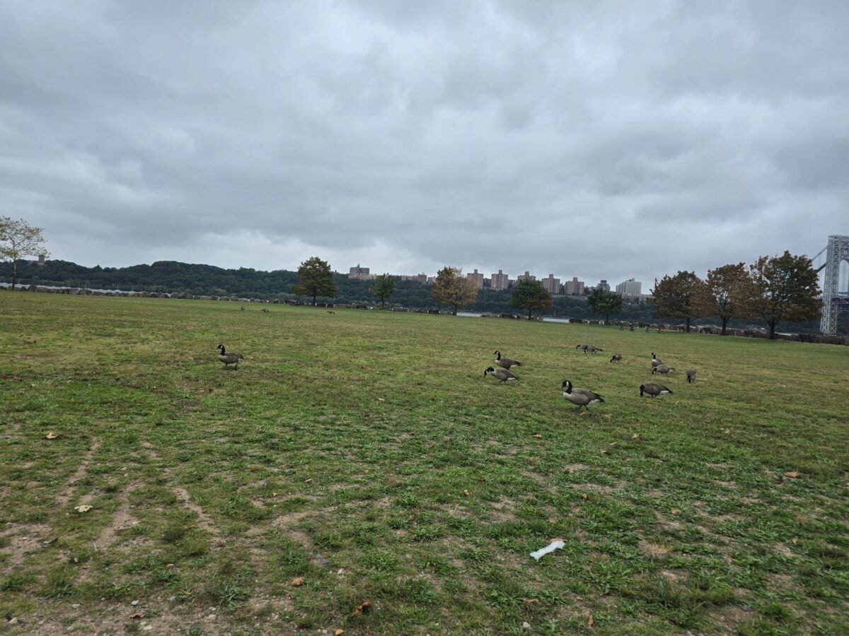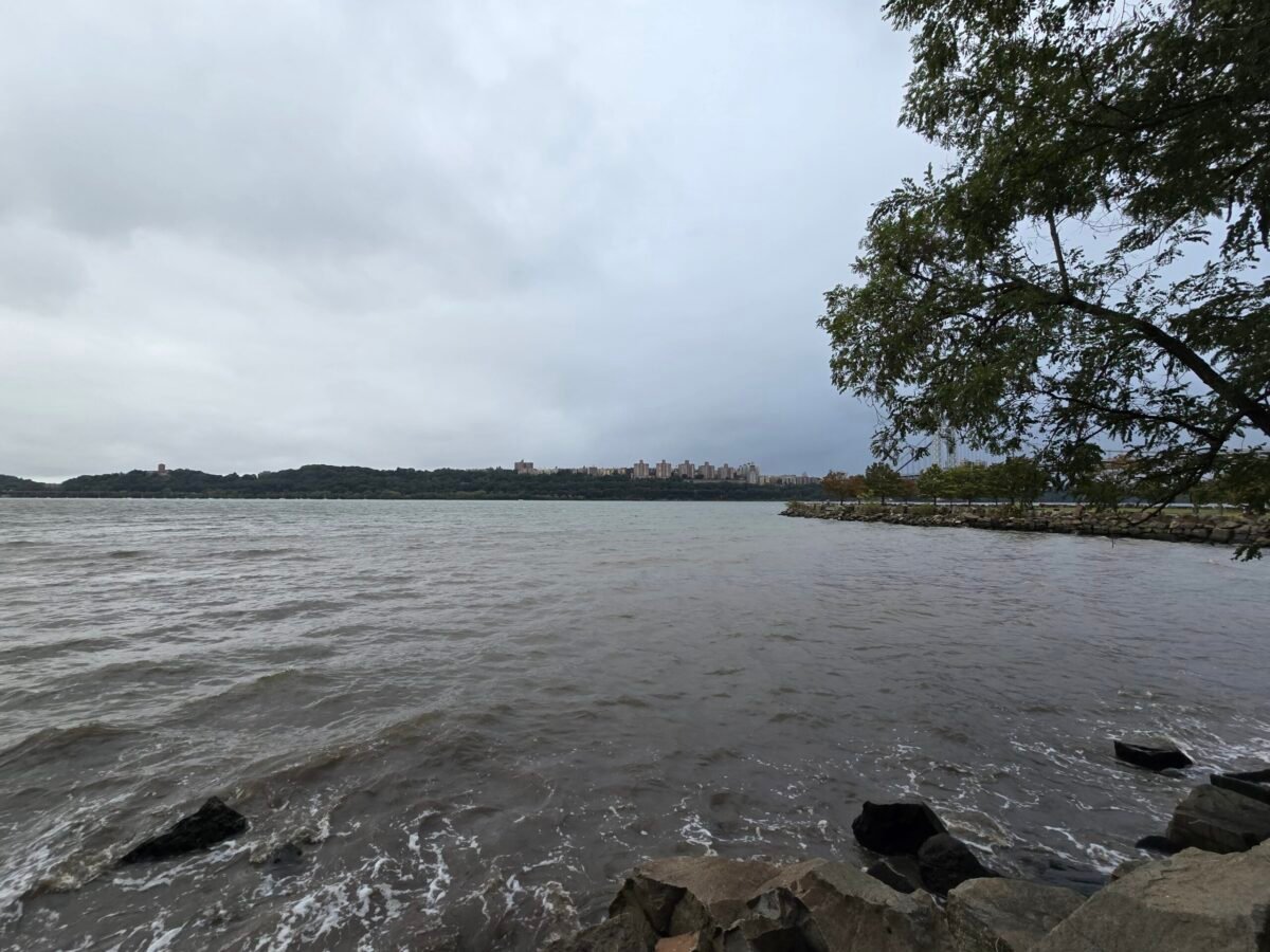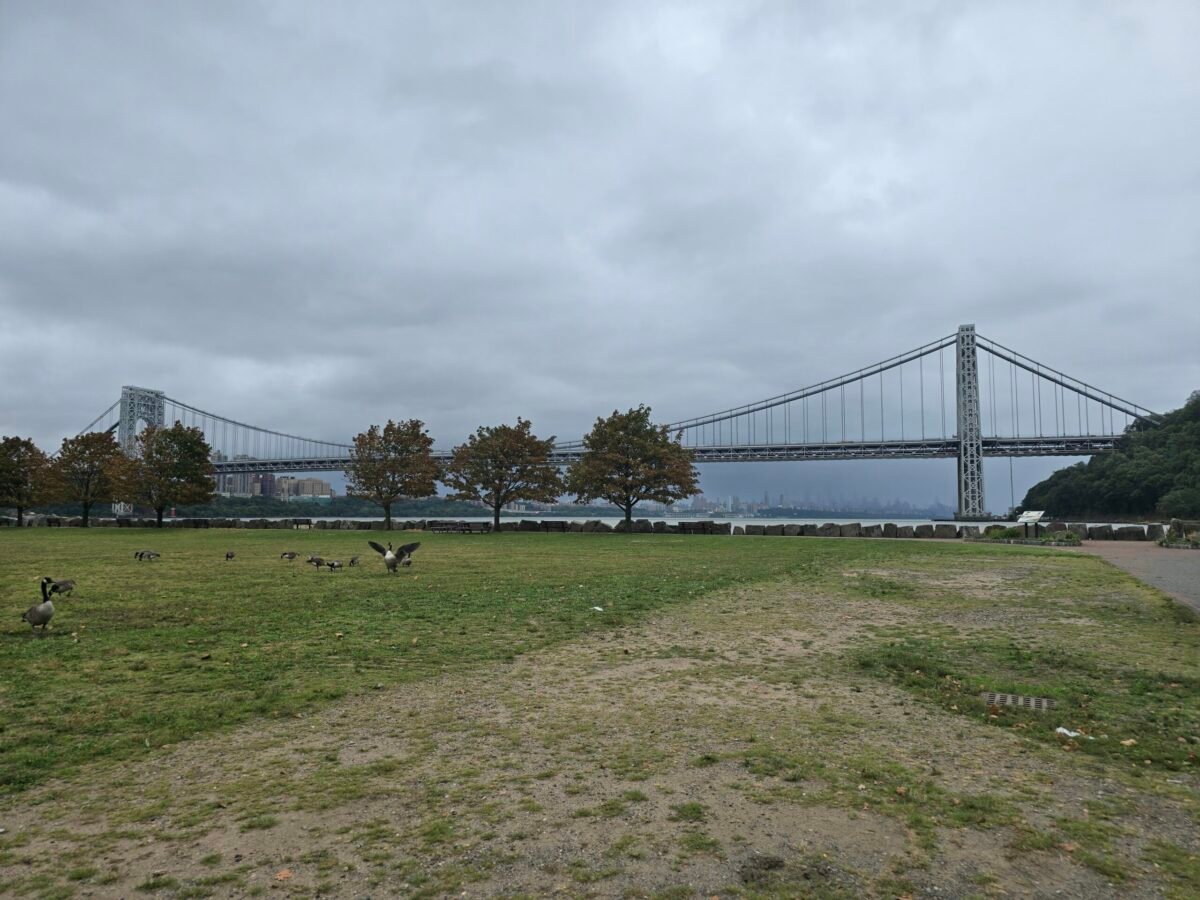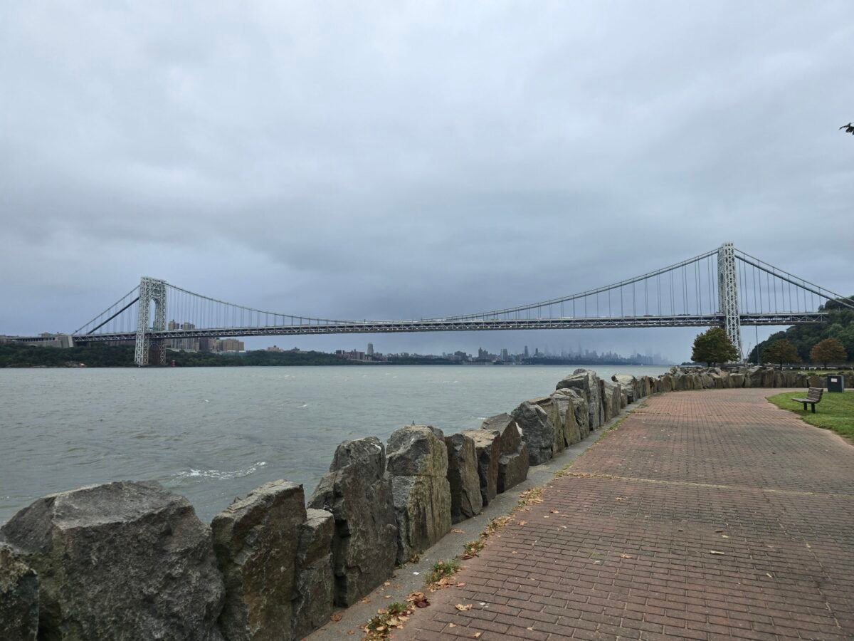 보슬비가 내려 길이 촉촉했고, 공기가 더 시원하게 느껴졌으며, 조지 워싱턴 브리지가 멀리 우뚝 서 있고, 허드슨 강은 잔잔하게 출렁였다.